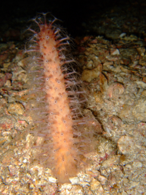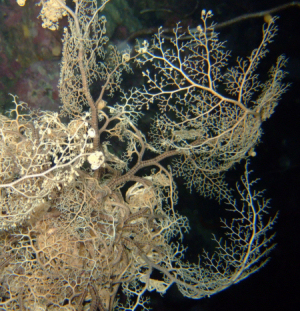 This lace work of art is a relative to the sea stars, in daytime they are coiled up like a ball of yarn and hidden in a crevice; but at night they unfold themselves in all there glory and beauty, filtering the water with this network. Another filtrator is a relative of the sea anemones using the arms to catch what is drifting by, and then - arm after arm - feeding the catch down in the mouth in the middle. |
