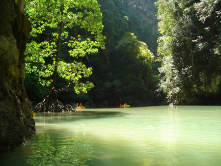 Another day with Seacanoe we visited some of these islands to see the interior. The size of the entrance to these secluded worlds are very different. In one island the entrance is just a little opening over the waterline, so small that the guide had to let some air out of the canoe, before it was possible to enter. In the next island the entrance was lofty enough to house bats. But well inside - Fantastic! An indescribably, almost celestial atmosphere of silence and beauty. It is strongly recommendable!