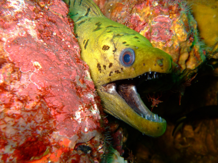 This charming fellow is a yellow moray eel, and the other is a sleeping Parrotfish Just in front of its snout you can see a Tubastrea coral that is open only at night, and in front of that again a little fish called a Blennie. |