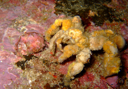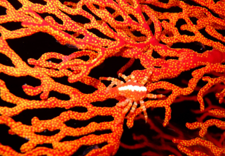 These two very different crabs are both spidercrabs - showing us two different camuflage techniques. The first is collecting and fastening diverse marine organisms, algae and detritus on its body and legs. The other one is mimicking its surroundings, here a red Gorgonian coral. The first is 10 cm the other 15mm. |