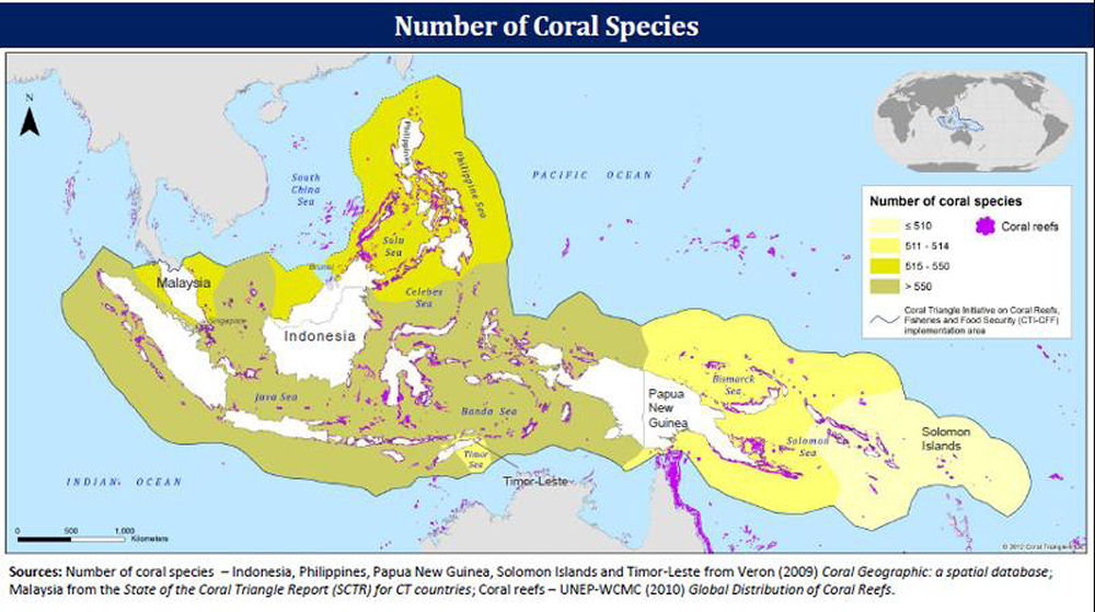 KoraltrekantenJeg bliver tit spurgt om, hvor det er bedst at dykke. Jeg har før i tiden været diplomatisk med mine svar og sagt, at det er lidt af en smagssag. Det er det selvfølgelig også, men nu tør jeg efterhånden godt være klar i mælet og udtrykke min klare kærlighed til koraltrekanten. Og min erfarede begrundelse kan jeg vise med et kort, hvorpå man kan se, at i det område findes den største biodiversitet i alle have. Sic! |